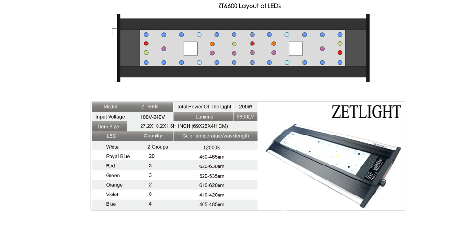 O sistema de iluminação da ZT6600 permite 5 períodos configuráveis de simulação na iluminação: Amanhecer, Nascer do sol, Pôr do sol, Luz do dia e Período noturno. Em cada periodo o usuário pode ajustar brilho independente e combinar diferentes ondas de luminosidade ao seu favorito espectro de cores. Para simular o ambiente de Nascer do sol e Pôr do sol, a Zetlight combinou LEDs laranja e vermelho num elegante design de efeitos de luz.